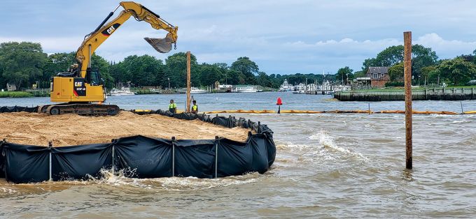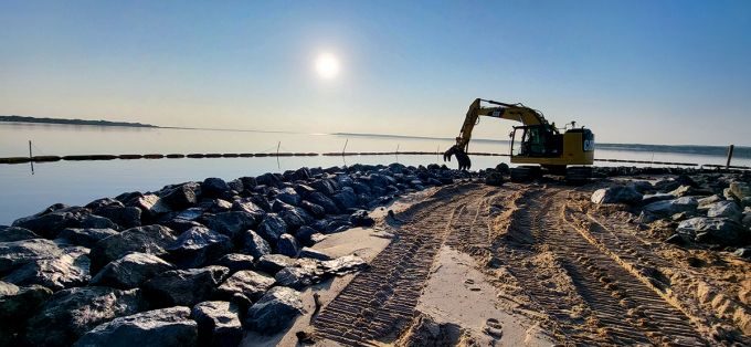 The coordination between multiple government agencies and two Native American tribes in developing a solution to protect the area’s natural ecosystem while preserving cultural artifacts represented a major undertaking. For months, several tons of sand, granite, vegetation and oysters were hauled into Indian Island and strategically graded, planted and placed to build a rock sill solid enough to withstand decades of wave and tidal action.