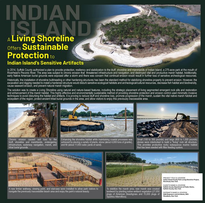 - 2025 ACEC New York Gold Award in Category G: Water Resources for its Indian Island County Park Living Shoreline Project, which was designed to provide protection, resiliency and stabilization to Indian Island’s bluff, shoreline and marshlands which were subject to chronic erosion that threatened the area’s infrastructure and navigation, coastal ecosystem and sensitive archeological/cultural artifacts. Read More