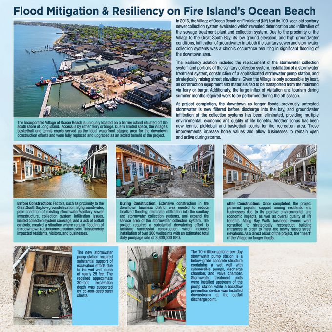 The Ocean Beach Flood Mitigation and Resiliency Project was designed to upgrade the sanitary and stormwater infrastructure within the downtown area of the Village of Ocean Beach. Located on the barrier island of Fire Island (NY), this popular summer vacation community was experiencing increasingly severe flooding and groundwater infiltration of both the existing sanitary and stormwater collection systems. Project improvements included the replacement and expansion of the stormwater collection system, partial replacement of the sanitary collection system, new stormwater treatment units, and construction of a below-grade stormwater pump station to reduce downtown flooding conditions. Despite multiple logistical and scheduling challenges, construction was successfully completed on time and on budget in July 2024, bringing environmental, economic and quality of life benefits to residents, business owners and visitors of Ocean Beach.