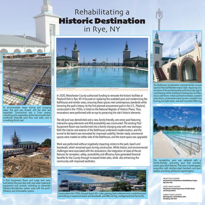- 2025 ACEC New York Platinum Award in Category I: Special Projects for its Playland Pool and Bathhouse Rehabilitation Project, which renovated the historic facilities at Playland Park, the nation’s first amusement park that opened in 1928. Project goals were achieved while preserving the property’s historic architectural elements and allowing the park to remain open during construction. Read More