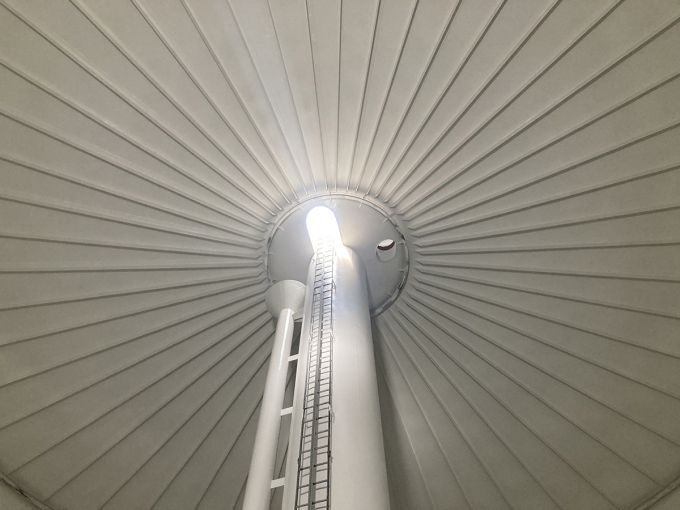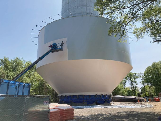 This tank is only the second of its style on Long Island, with the first having been built three years earlier with a smaller capacity. The exterior of the tank is finished with an advanced fluoropolymer topcoat, which not only enhances its glossy appearance but also provides superior protection for the exposed steel, extending the lifespan of the coating system.