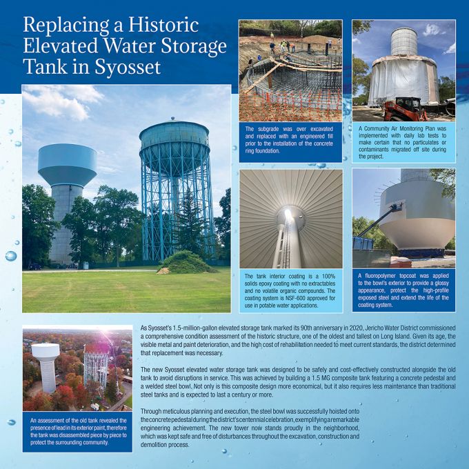 - 2025 ACEC New York Silver Award in Category G: Water Resources for its Replacement of 1.5 MG Syosset Elevated Tank Project, which was designed to provide Jericho Water District with a safe, cost-effective upgrade while ensuring continuous service and replacing its 90-year-old elevated storage tank. Read More