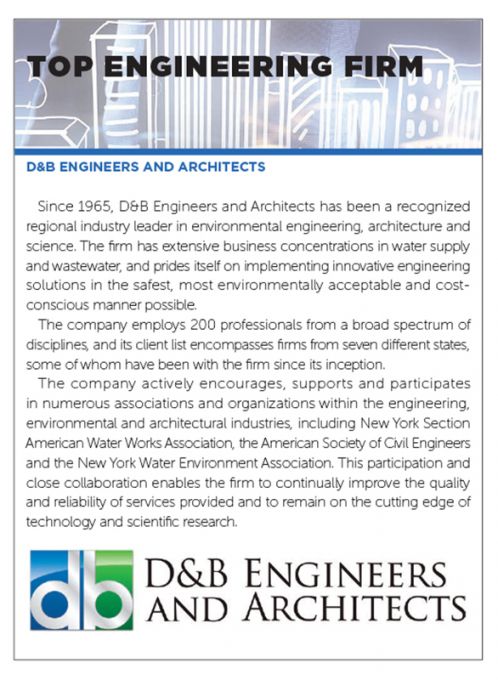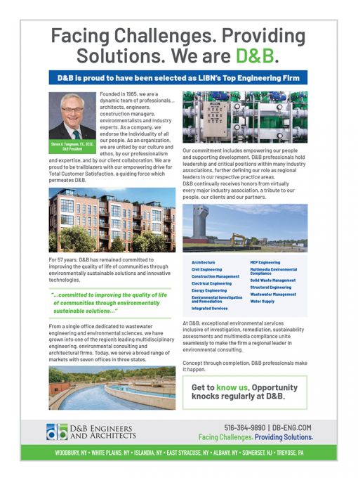 D&B President Steven A. Fangmann, P.E., commented, “On behalf of all at D&B, I thank LIBN for recognizing us as an industry leader. We are honored to receive this award. It is a testimony to D&B’s focus on environmentally acceptable engineering solutions for municipal and private projects on Long Island and in surrounding communities since 1965.”