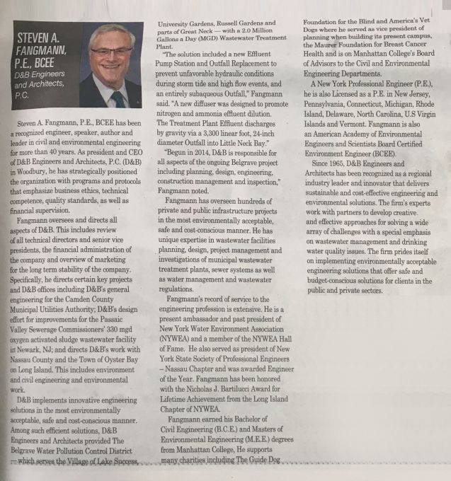 President of D&B Engineers and Architects, Steven A. Fangmann, P.E., BCEE, was featured in LIBN’s Who’s Who in Environmental Consulting, Engineers & Construction special supplement section on April 30, 2021. Mr. Fangmann was also recently highlighted in LIBN’s Sustainability section.