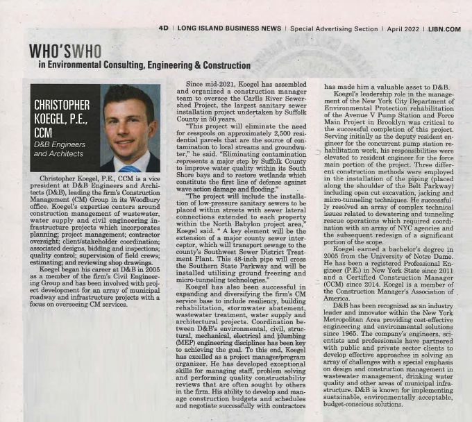 D&B’s Christopher Koegel, P.E., CCM was featured in Long Island Business News’ April 29, 2022 special section on Who’s Who in Environmental Consulting, Engineering & Construction. The article highlighted D&B’s work on the Carlls River Sewershed Project, the largest sanitary sewer installation project undertaken by Suffolk County in 50 years. Read on below.