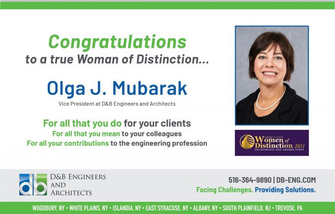 D&B Engineers and Architects congratulates Vice President Olga J. Mubarak for being honored at Blank Slate Media’s first annual Nassau County Women of Distinction 2021 Event.