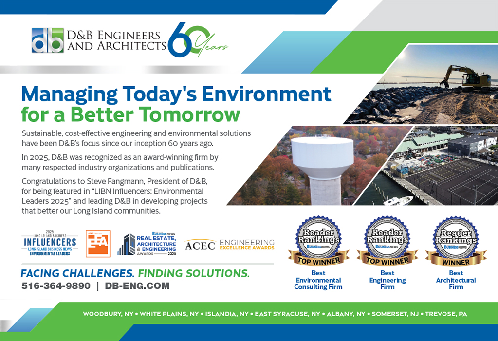 Fangmann commented, “Being named to this year’s Influencers Environmental Leaders list is a meaningful acknowledgment of D&B’s ongoing efforts to confront the environmental challenges facing our communities. I remain committed to advancing sustainable engineering solutions to protect public health and strengthen Long Island’s future.”
